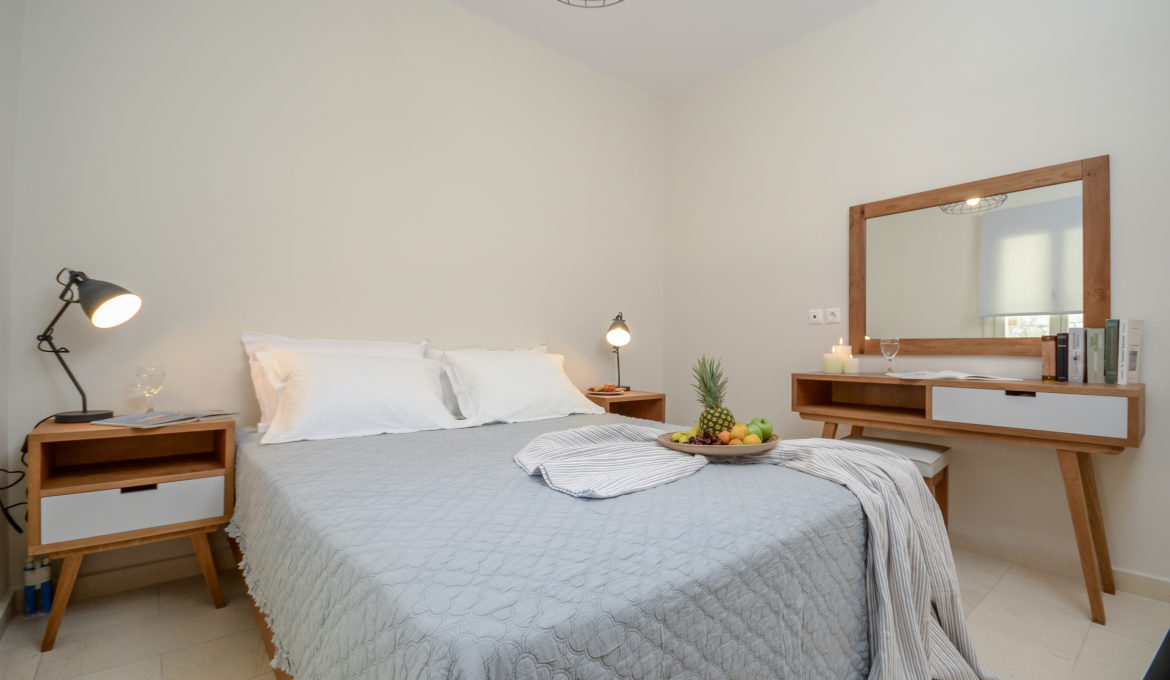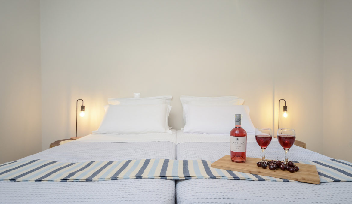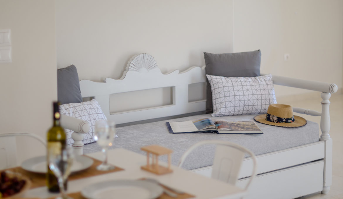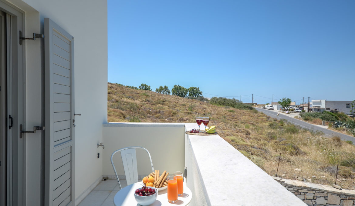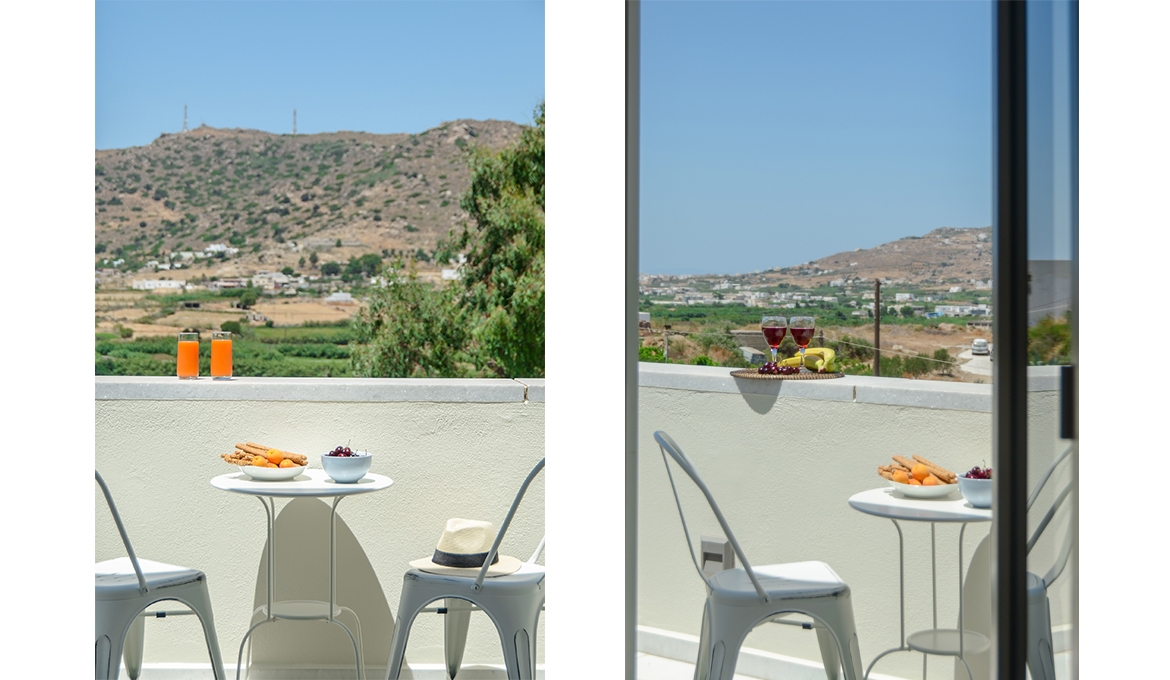 The love we have, as a family, to nature made as name our houses after our favorite flowers. Yasemi derives from the Persian Yasameen which means ‘God’s gift’. It is our biggest house (80m2), brand new, spacious and quiet. Decorated in minimal and elegant touches, it is ideal for families, couples and groups of friends who want to enjoy relaxation and revitalization. The house has two bedrooms, one with a king size bed and one with a twins bed, two bathrooms, a large living room with a sofa bed, a fully equipped kitchen and two balconies. The kitchen is fully equipped with cookware utensils, refrigerator, ceramic hobs, oven, coffeemaker, Nespresso coffee machine, toast maker. Free WiFi, flat–screen smart-TV with satellite channels and private parking area also provided.  The astonishing view from our balcony will give you the opportunity to get lost inside the colors of Naxos’ beautiful sunsets.